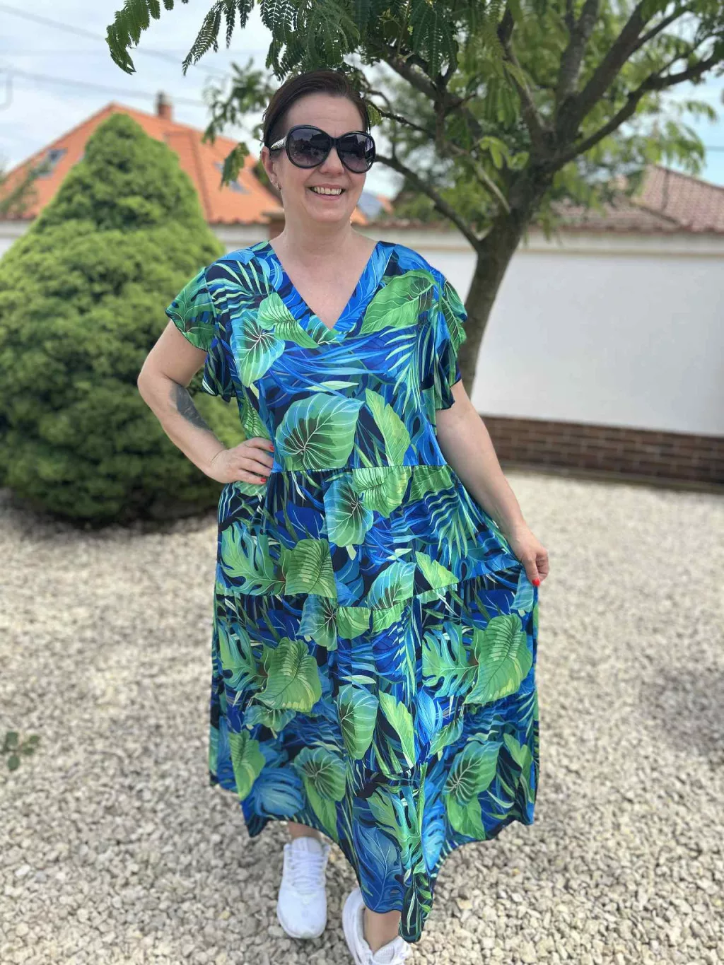 • Zöld-kék színű levélmintás A-vonalú ruha