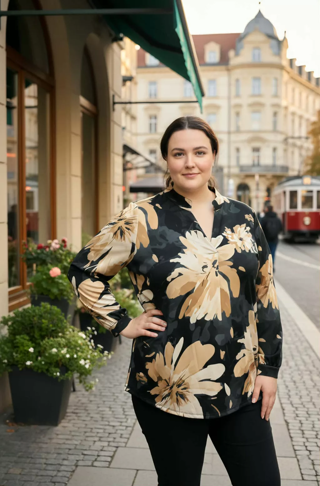 • Fekete-barna-ekrü színű exkluzív egyedi mintás felső