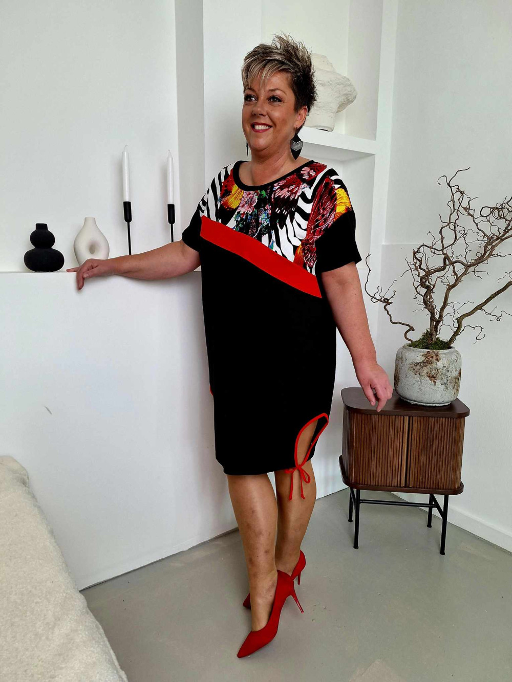 • Piros-fekete színű egyedi mintás ruha, egyméretes, XL-3XL-ig ajánlom