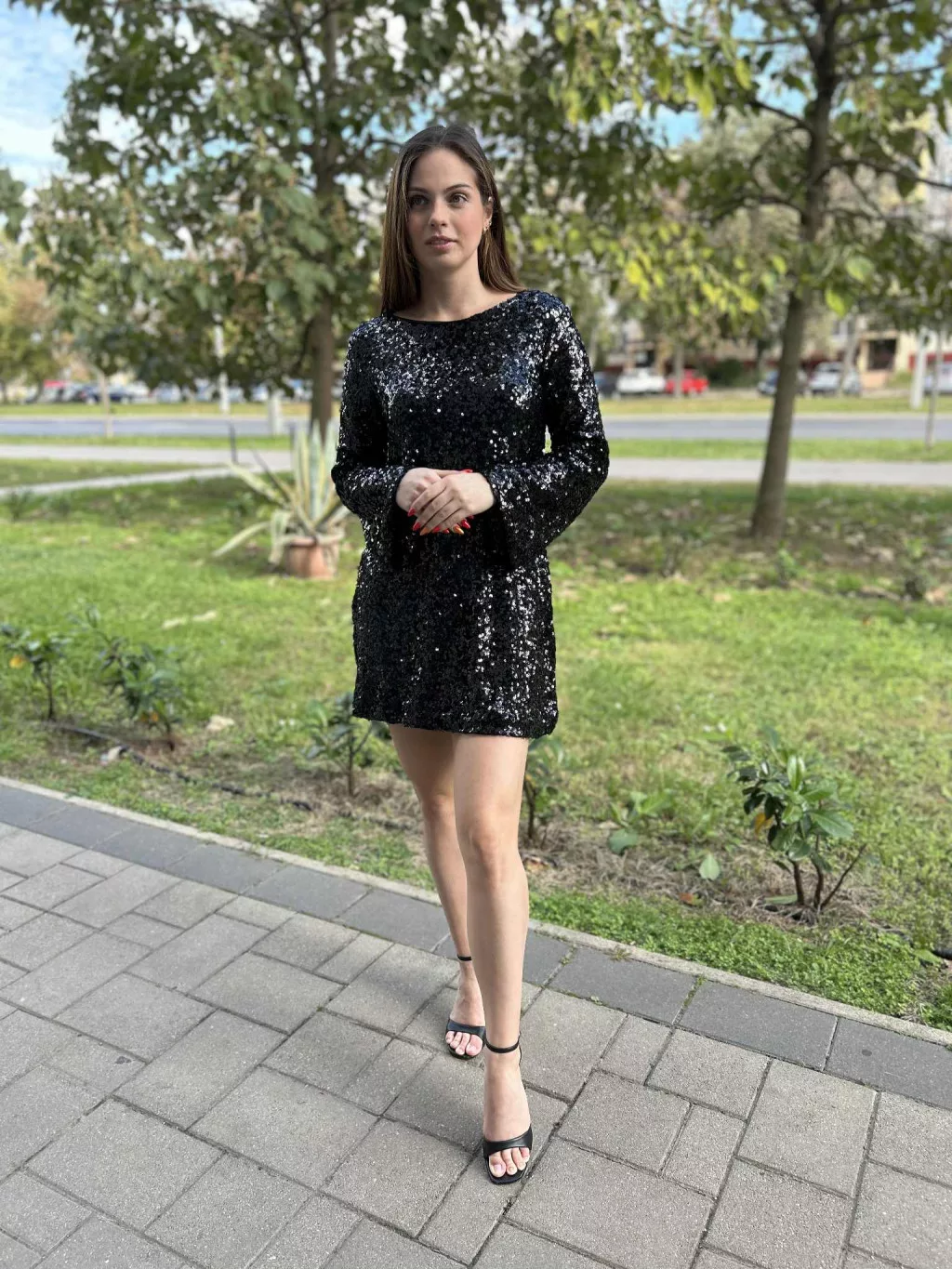 • Csillogó fekete színű flitteres ruha, van alatta plüss anyag bevarva ( nem szúr)