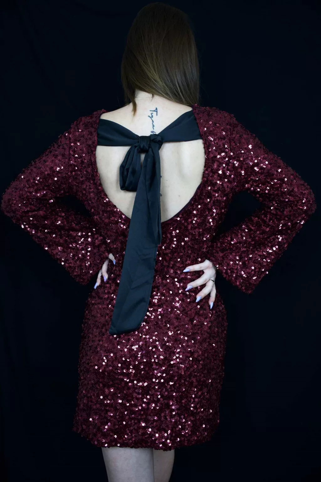 • Csillogó burgundi színű flitteres ruha, van alatta plüss anyag bevarva ( nem szúr)