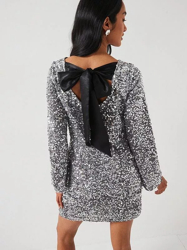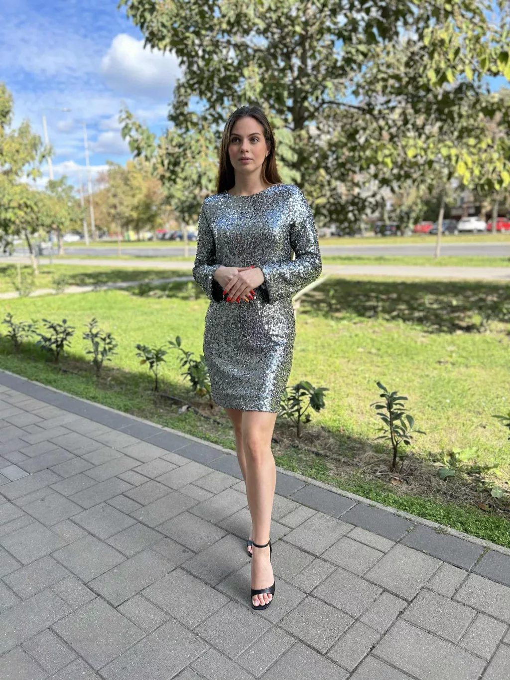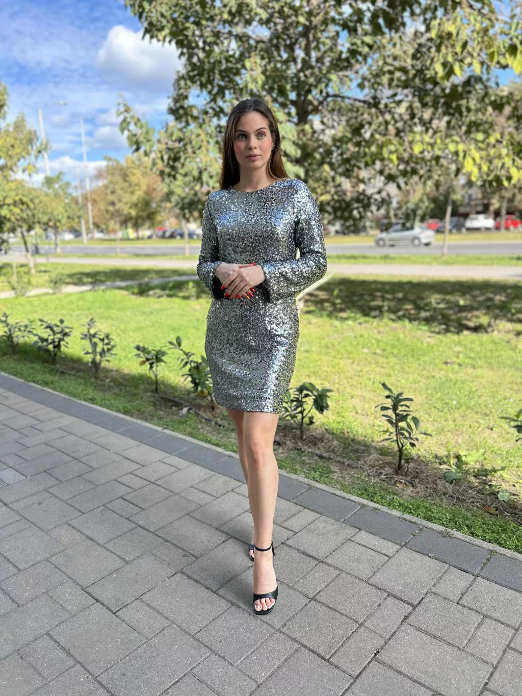 • Csillogó ezüst színű ezüst flitteres ruha, van alatta plüss anyag bevarva ( nem szúr)