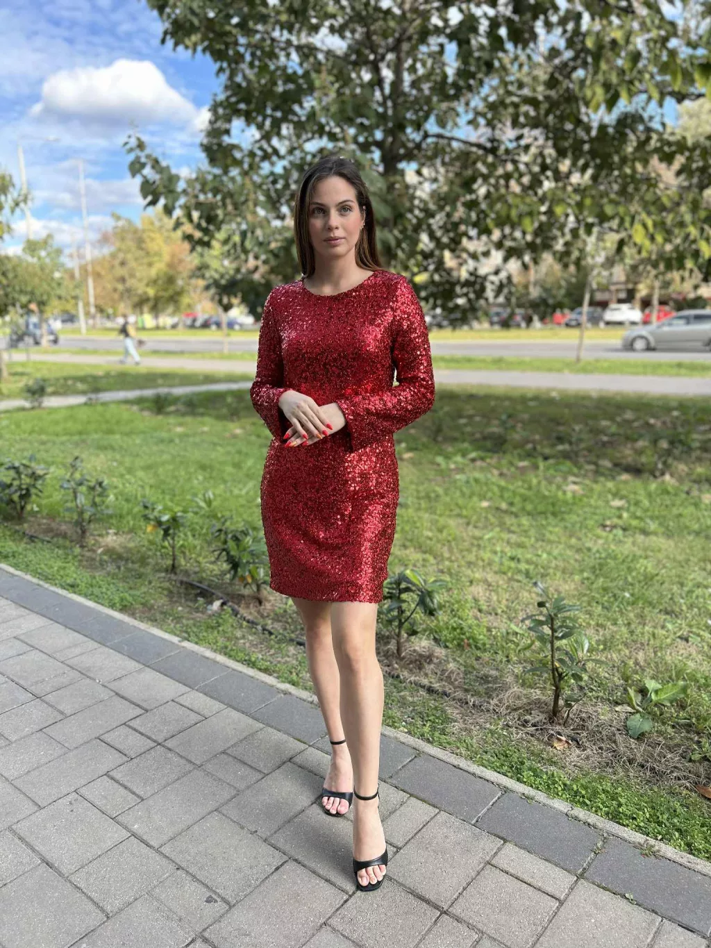 • Piros színű flitteres ruha, van alatta plüss anyag bevarva ( nem szúr)